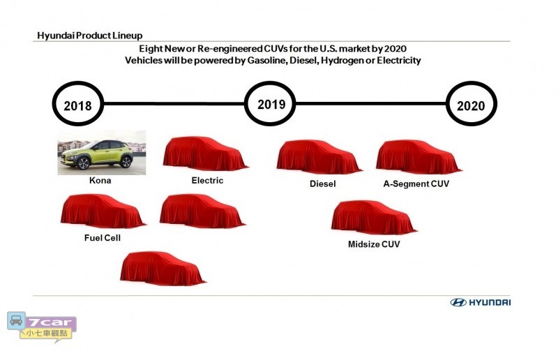 產品範圍從A-segment CUV到8人座旗艦中型SUV,其中動力總成還包括了傳統燃油汽、柴油引擎和Fuel Cell燃料電池、純電動車等,而6月份發表的Kona正式此計畫的第一先鋒。