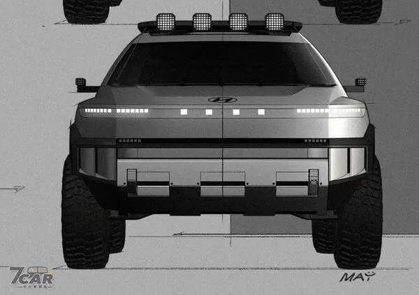就目前的線索來看,Crater 擁有相當挺拔的車身比例,短前後懸、外擴輪拱與明顯的越野姿態,都讓人感受到 Hyundai 想在設計上做出更大突破。車頭採用封閉式格柵,配上簡潔的燈組排列,整體呈現出未來感與工具性兼具的語彙,似乎暗示這款概念車不僅僅是造型練習,而是設想「更硬派」的品牌個性如何落地。對應 Hyundai 近年推出的 XRT 套件,Crater 看起來像是這套風格轉型為真正越野車系之前的一次試驗。