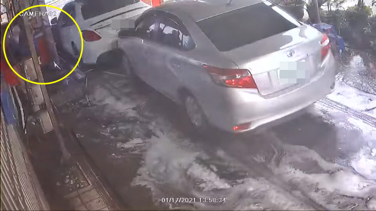 當時4名員工操作洗車,擦玻璃的員工到一半嚇得倒退,眼睜睜看著賓士被推不見,附近3人也都躲到一旁,其中一名女員工甚至摀起耳朵、低頭快步從後方要通過,未料肇事駕駛竟倒退出來,不僅追撞賓士,還把洗車隧道內的檔版拆掉,差點就輾過她,讓眾人看得直冒汗!