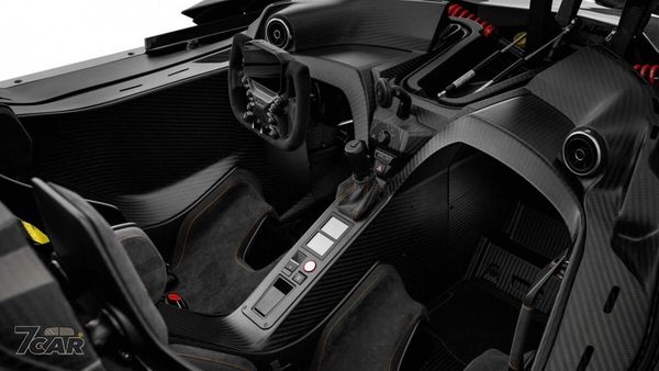內裝採用簡單戰鬥的設計,配置了兩張碳纖維打造的賽車座椅,駕駛前方為具電動轉向輔助及液晶儀錶的可拆卸式方向盤,中央更具有 Quadlock® 支架以方便手機感應充電,另外也附有兩個額外的 Type C 插槽以便不時之需,引擎室前方擁有高達 160 公升的收納空間,原廠更提供 Meindl 客製化皮箱來搭配。