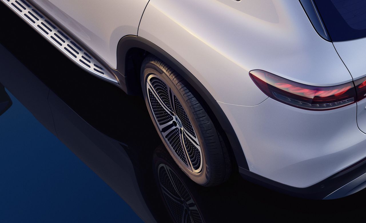 ▲25年式EQE 350 4MATIC SUV將後輪轉向列為標準配備,能有效縮小迴轉半徑。(圖/翻攝自Mercedes-Benz)
