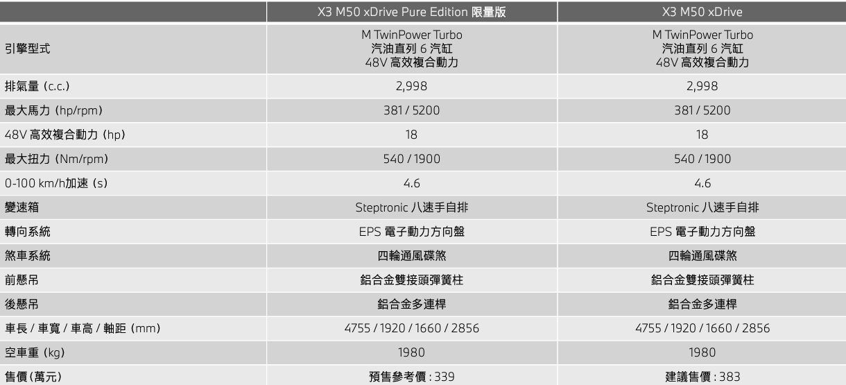 台灣原廠即將在5月推出新X3 M50 Pure Edition特仕車,經銷端流出339萬預售價,採用3.0升直列6缸渦輪,搭配48V輕油電系統,結合Steptronic 8速手自排變速箱,輸出具有381匹馬力、55.1公斤米扭力,4.6秒完成破百加速衝刺。
