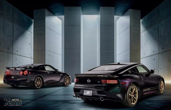 這款特別版以 Z Performance 車型為基礎,外觀靈感取自 300ZX 與 GT-R,最大亮點是塗裝了 Midnight Purple 紫色車漆,這種色調正是過去 Skyline GT-R 時期深受喜愛的代表色。車輛同時換上 19 吋 RAYS 鍛造鋁圈,並以古銅色塗裝搭配車身側面的「Twin Turbo」字樣彩繪,與 90 年代的日系性能車風格呼應。尾部則可見碳纖維尾翼,以及專屬 Heritage Edition 徽章,讓這台車的定位一目了然。