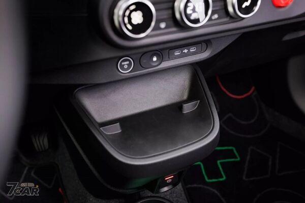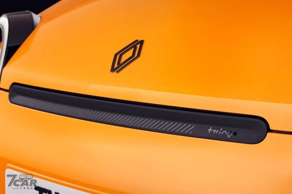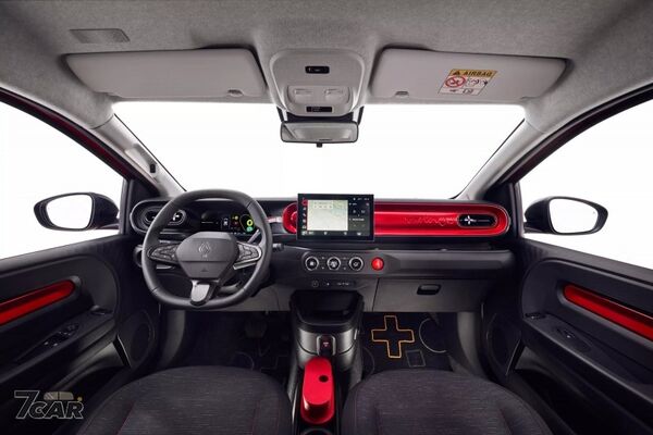 細節部分,Twingo E-Tech 保留大量概念車風格,儀表台飾板可依車色變換色調,車頂內襯印有 Twingo 專屬字母圖案,排檔設計更以「e-pop shifter」為名,外形靈感源自唇膏造型,展現品牌年輕且不拘一格的性格。