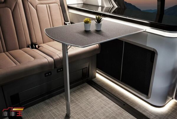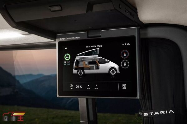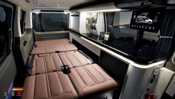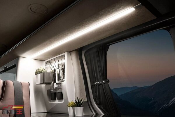 外觀設計大致延續 Staria Electric 的輪廓,不過在車尾燈附近新增了水源與電力的外接介面,展現其露營導向的實際用途。車內則是本次概念重點之一,第二與第三排座椅可完全攤平,形成可供 2 名成人休息的平整睡眠空間,讓車內配置能在乘載與住宿之間快速轉換。側邊設置一組長形操作檯,整合洗手槽、收納空間,以及容量約 36 L 的車用冰箱,搭配折疊式桌板、壁掛式收納板與專屬照明系統,整體風格偏向實用與質感兼具,而非過度商業化的改裝風格。