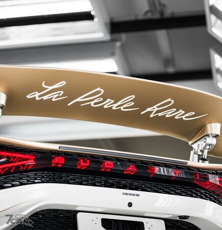 座艙設計則延續外觀理念,將白色塗裝碳纖維元素融入車內鋪陳,營造如珠寶盒般的視覺氛圍。車門飾板以白與暖金線條交錯點綴,並輔以柔和環艙照明,進一步強調珍珠主題。細節處亦可見對品牌歷史的致敬元素,包括靈感源自 Rembrandt Bugatti 的「躍舞大象」圖騰,分別出現在排檔機構與車身飾板位置。此外,「La Perle Rare」專屬字樣以設計師親筆簽名形式呈現於多處細節,為這部敞篷鉅作劃下鮮明的個性印記,也體現 Sur Mesure 計畫強調的專屬價值與品牌傳承精神。